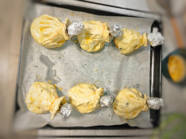 Сверху выложите картошку с грибами, в центр поставьте куриную ножку. Тесто защипните вокруг косточки и завяжите ниткой. Выступающие из мешочка косточки голени заверните в фольгу, чтобы не обгорели.
