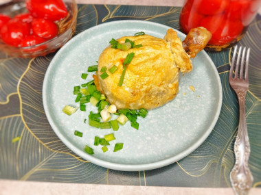 Курица в мешочке из слоёного теста — изумительное порционное блюдо для семейного ужина или праздника. Картошку порезала мельче, чтобы она быстрее сварилась. Ножки и грибы обжаривала до золотистой корочки, добавила чеснок, а вот зелень была только в виде зелёного лука, который использовала для украшения готового блюда. Слоёного теста лучше взять побольше, потому что у меня его оказалось маловато, и оно местами порвалось, да и в духовке чуть-чуть вылезла картошка. Мешочки смазывала взбитым яйцом, чтобы они стали более румяными. Блюдо действительно способно удивить! Единственное, вместо нитки стоит придумать что-то другое, поскольку она запекается вместе с тестом и её трудно потом вытащить. Зато в готовом виде косточка куриной ножки легко вытаскивается и отделяется от мяса, что очень удобно. Рецепт беру в свою кулинарную копилку и настоятельно рекомендую!