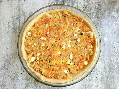 Выложите остывшую начинку из капусты и яиц на тесто в форме ровным слоем, слегка утрамбовывая. Не насыпайте горку в центре, разравнивайте начинку, чтобы края пирога и середина пропеклись одинаково.