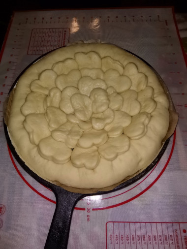 Меньшую часть теста раскатайте аналогично. Вырежьте круглой выемкой кружки из теста и выложите на начинку сверху в виде цветка. Но можно сделать верх пирога на свое усмотрение и украсить по желанию.