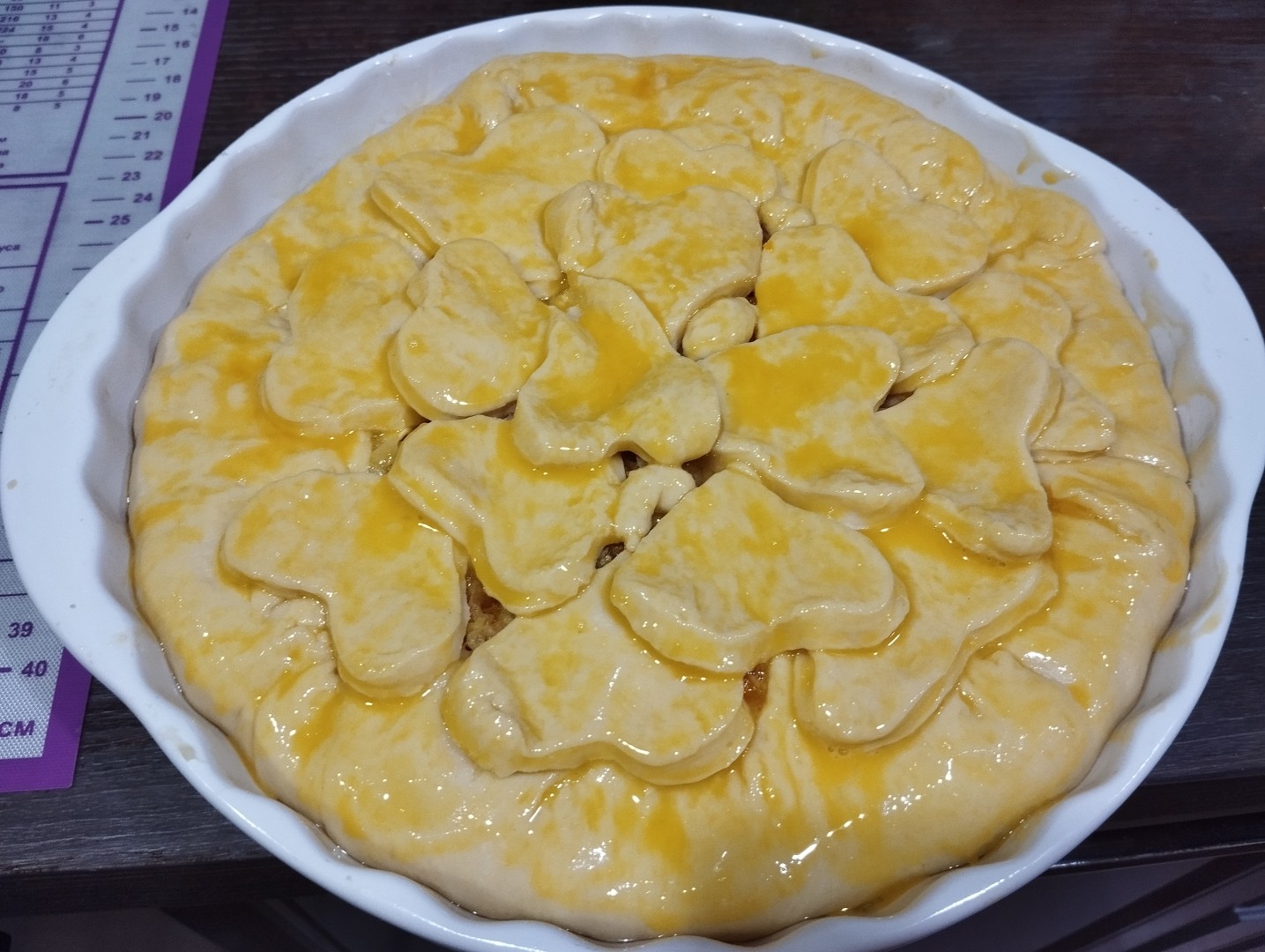 Во время формирования верха пирога между кружочками теста должны оставаться маленькие дырочки для выхода пара во время выпечки либо можно сделать дырочку посередине. С помощью кулинарной кисти смажьте желтковой смесью пирог сверху.