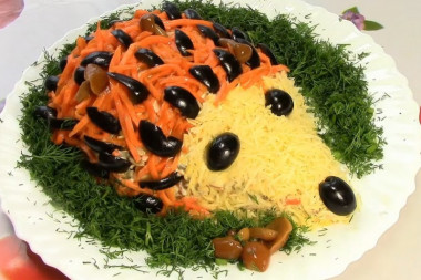Теперь выложите корейскую морковку по линии иголочек ёжика и украсьте его "шубку" кусочками черных оливок.