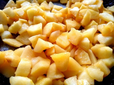 На сковороде растопите сливочное масло и добавьте сахар. Выложите нарезанные яблоки и тушите 5-7 минут, чтобы из них выпарилась лишняя влага. Затем начинку остудите.