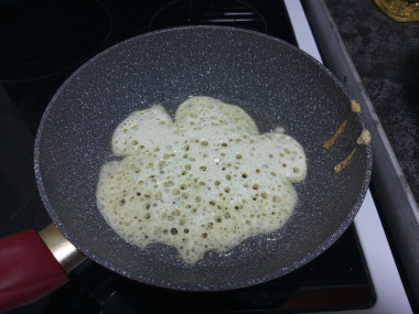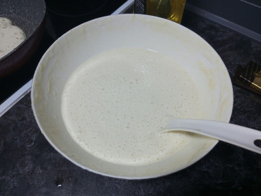 Накройте миску чистым кухонным полотенцем и поставьте её в тёплое место на 1,5 часа. Затем добавьте растительное масло и перемешайте, если тесто показалось вам слишком густым, добавьте воды. Начните выпекать блины. Для этого блинную сковороду смажьте растительным маслом и при помощи половника налейте небольшое количества теста на сковороду. Другой рукой делайте круговые движения, чтобы достичь равномерного распределения теста по поверхности сковороды.