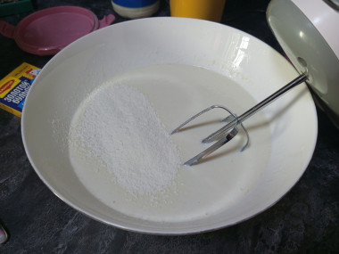 Подготовьте глубокую миску или небольшую кастрюльку. 200 мл сливок нагрейте до 35 градусов и всыпьте сахар. Перемешайте венчиком до полного его растворения.