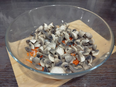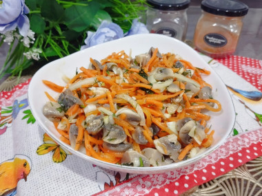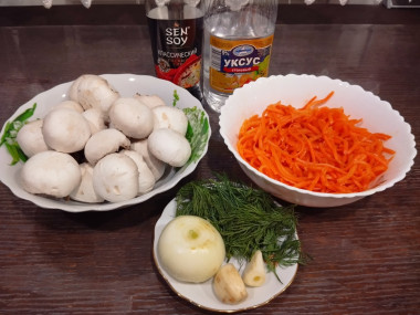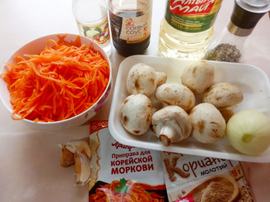 Шампиньоны с корейской морковью и луком очень вкусный салат. И так как у меня морковь была уже готовая,я немного изменила рецепт.