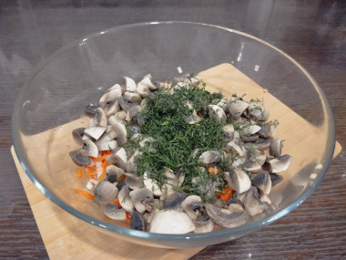 Выложила в салатник корейскую морковь, измельченный чеснок, маринованный лук, шампиньоны, измельченный укроп( заменила петрушку). Добавила немного масла растительного и перемешала.