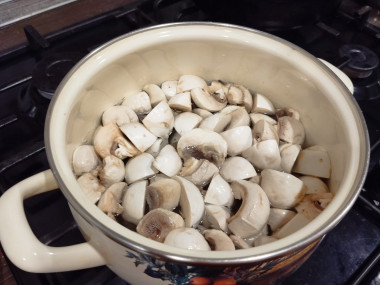 Шампиньоны порезала на четвертинки и отварила.