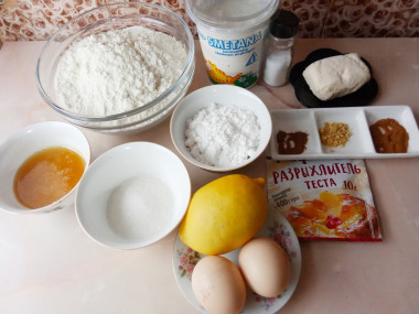 В полученную массу всыпьте просеянную с пряностями и разрыхлителем муку, перемешайте ложкой. Оставленную муку подсеивайте небольшими порциями, одновременно замешивая тесто руками. Муки может понадобиться больше или меньше указанного количества. Это зависит от свойств и качества муки, густоты сметаны, размера яиц.