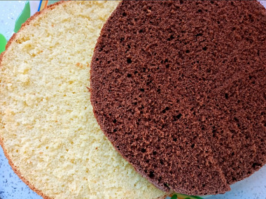 Скажу честно, первый (светлый) корж не получился из-за моей ошибки, так как забыли добавить вторую часть сахара (шаг 5) из-за чего пришлось его добавлять на шаге 7 и работать миксером, после чего тесто в духовке не поднялось. Учла этот момент при выпекании второго (темного) коржа. Он поднялся в 2 раза!