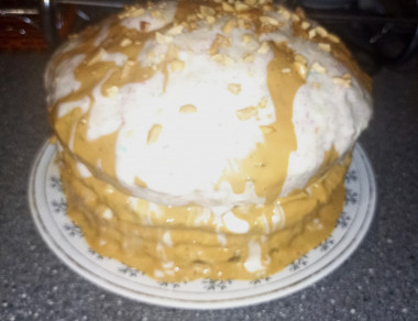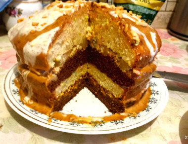 Для того чтобы испечь классический торт достаточно испечь 2 бисквита и сделать сметанный крем, но я простых путей не ищу и решила усложнить свою задачу. Я очень люблю высокие торты с пропиткой и вкусным кремом и наполнением прослоек. В своем рецепте я использовала также 2 Коржа день и ночь, но в светлом добавила кокосовую стружку и 5 яиц. Крем в моем рецепте идет другой. Первый густой сметанный крем с вареным сгущеным молоком и сметаной (получился очень вкусно), а второй с с кокосовой стружкой и корицей. Прослойка торта из измельченных кадровых орешков и фруктов (у меня используется консервированный ананас). Я являюсь новичком в выпечка тортов и не особо верила в хороший результат, но в итоге я превзошла себя. Вкус просто восхитительный. А крем особенно со сгущенкой, как будто ешь конфетку вкусную. Вдохновил на выпечку торта данный рецепт и случайно я попала на кондитерский сайт, где все подробно рассказано как все делать. Самое важное, что я отметила для себя главное понять сам процесс приготовления и запастись терпением и все получится. Не судите строго. Я ещё учусь и надеюсь со временем буду делать хорошие работы.