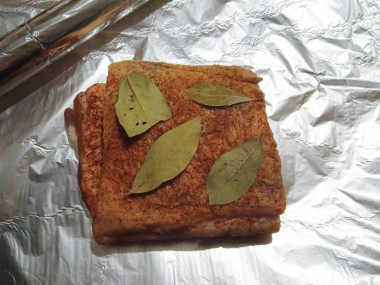Выложите подготовленную грудинку на лист фольги. Сверху выложите несколько листиков лаврового листа.