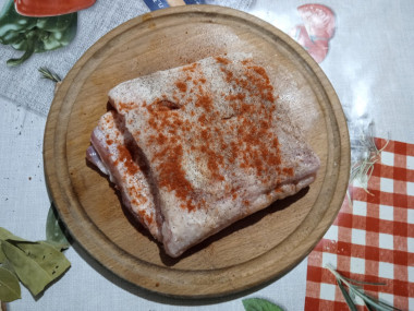 Затем посыпьте куски грудинки солью, молотым перцем и специями по своему вкусу. Я воспользовалась паприкой. Вотрите соль и специи руками в кусок.