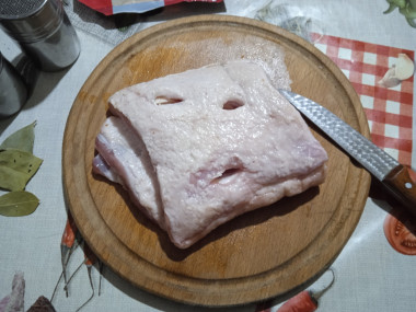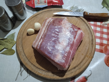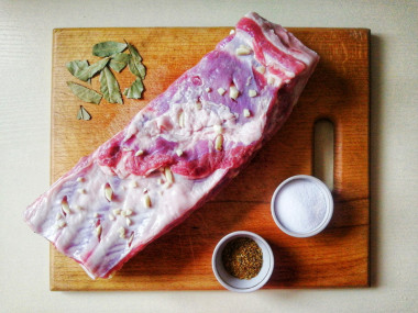 Свиную грудинку промойте в проточной воде и хорошо обсушите с помощью бумажного полотенца, чтобы удалить всю лишнюю влагу с поверхности куска. Чеснок очистите от шелухи. По бокам грудинки сделайте прорези острым ножом и вставьте дольки чеснока. Если зубчики чеснока очень крупные, то можно каждый зубчик разрезать на 2-3 части.