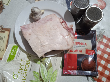 Как запечь свиную грудинку в фольге в духовке? Подготовьте все необходимые ингредиенты. Свиную грудинку берите охлажденную, которая еще не подвергалась заморозке. Иначе при размораживании из неё выйдут все соки и готовое блюдо получится сухим. Я люблю использовать грудинку с достаточным количеством мяса. Того малого количества сала, которое в ней есть, вполне хватает для сочности куска. Заранее разогрейте духовку до 190 градусов.