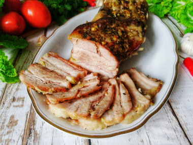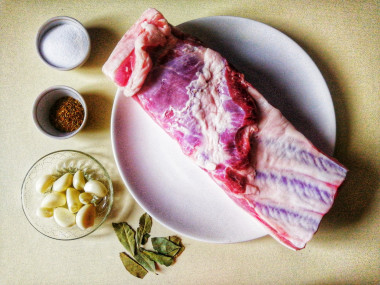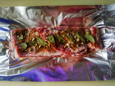 Перед тем как начать готовить, взвесила мясо, весы показали почти 1,5 кг. Вообще, надо было разрезать его на две части, но, так как кусок попался с косточками, я оставила его как есть. Нашпиговала грудинку чесноком, посолила, добавила прованские травы и лавровый лист, завернула в два слоя фольги и отправила в разогретую духовку. Запекала в течение 1,5 часов при температуре 220°.