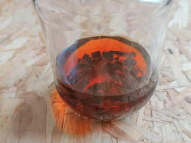 Дубовой бочки у меня нет, поэтому добавила в самогон дубовую щепу (1гр). И оставила на 2 недели (в соответствие с инструкцией на упаковке.