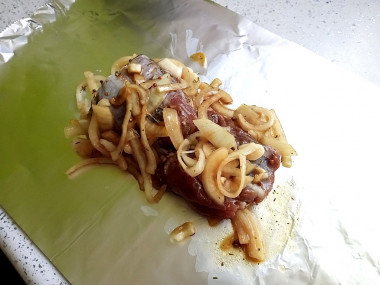Половину лука из мяса выложите на фольгу.