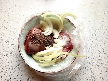 Мясо положите в удобную посуду и залейте его маринадом. Хорошо промассируйте мясо, чтобы оно приняло маринад.
