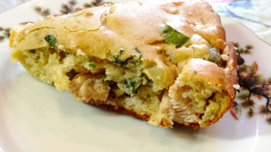 Вот такой пирог в разрезе. Как видите, жидкое тесто на майонезе хорошо пропекается. Приятного аппетита!
