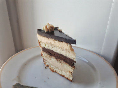 В итоге - тонкие воздушные коржи на миндальной муке, пропитанные кофейным сиропом, 2 слоя нежного масляного крема и терпкий насыщенный вкус шоколадного ганаша. Сверху я покрыла торт зеркальной глазурью из какао, сахара, сливок и желатина.