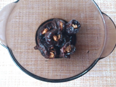 Орехи у меня свои, пожарила их в карамели на сковороде, вложила в промытый чернослив.