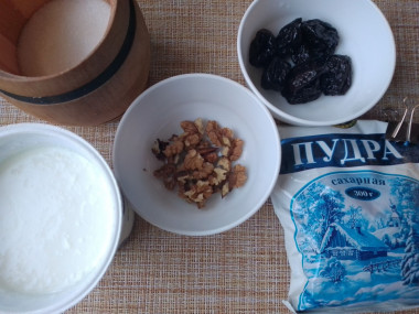 Как сделать десерт чернослив с грецким орехом в сметане? Подготовьте продукты. Чернослив возьмите качественный, сладкий, без косточек. Грецкие орехи вы можете взять уже очищенные или почистить их от скорлупы сами. Сметану выбирайте натуральную, без растительных добавок, оптимальная жирность — 20%.