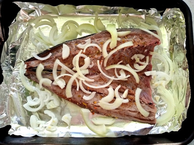 Сверху выложите нарезанный кольцами лук и лавровый лист.