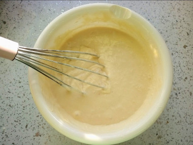 Хорошо перемешайте все ингредиенты до однородности. Муки может понадобиться чуть меньше или больше, ориентируйтесь на консистенцию теста. Тесто должно быть словно густая сметана, гладкая и без мучных комочков. Дайте ему обязательно постоять около 20-30 минут, чтобы мука выделила клейковину. Жидкое тесто для заливного пирога в духовке готово.