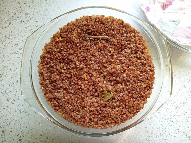 Завершающим слоем сделайте гречку. Слегка всё посолите.