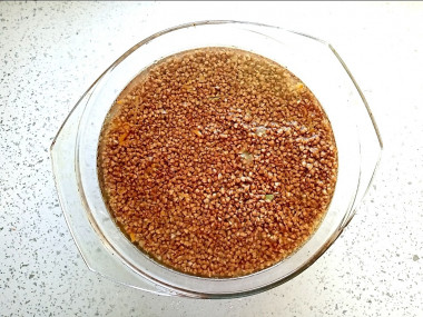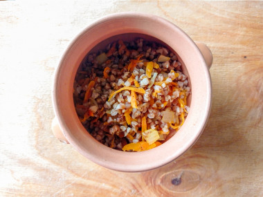Влейте в горшочки воду. Сколько использовать воды? Жидкость должна покрывать гречневую крупу примерно на 0,5-1 см. Учтите тот момент, что при запекании вода расширяется, а поэтому оставьте до краёв горшочков немного места(около 1-1,5 см.).