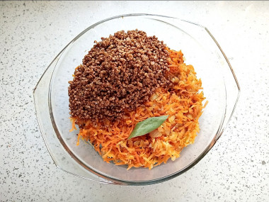 В форму уложила слоями мясо, зажарку, лавровые листочки и промытую гречку. Из специй добавила овощную приправу и душистый перец. Воды налила на 1 см. от уровня гречки.