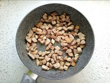В сковороде с толстым дном разогрейте растительное масло. О том, как подобрать идеальную сковороду, а также как правильно выбрать растительное масло, читайте в отдельных статьях, ссылки в конце рецепта. Обжарьте частями свинину (чтобы мясо именно обжарилось, а не тушилось), помешивая, до румяного цвета. Мясо должно дойти до полуготовности. При этом свинину слегка посолите и поперчите.