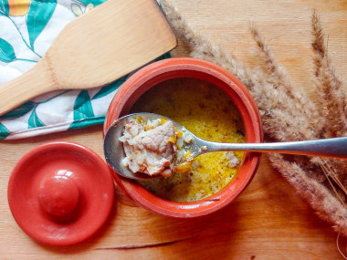 Свинину порезала на кусочки, обжарила и разложила по горшочкам. Далее выложила готовую гречку. Бульона у меня не было. Вместо него в теплой воде (800 мл) развела четыре столовые ложки сметаны, добавила смесь специй для мяса, соли. Разлила получившийся соус по горшочкам (по 200 мл) и отправила их в холодную духовку. Включила духовку на 180 градусов. Около 20 минут духовка разогревалась, и ещё 15 минут гречка с мясом готовилась.