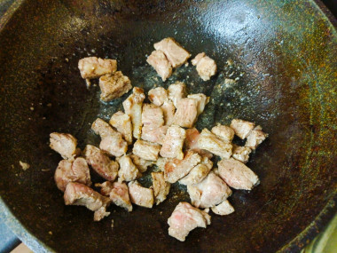 Выньте обжаренные кусочки в отдельную тарелку. В сковороду, где готовилась свинина выложите лук, морковку и чеснок. При необходимости влейте немного масла. На сильном огне, постоянно перемешивая, готовьте до мягкости лука и моркови.