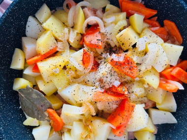Затем переложите обжаренные овощи в сковороду к мясу с картофелем. По вкусу добавьте соль и специи.