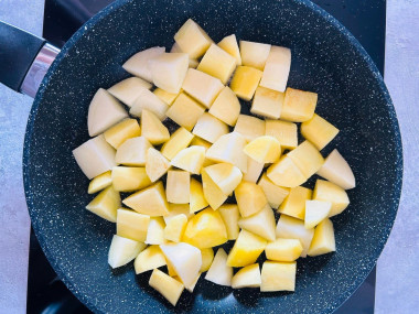 На другой сковороде обжарьте картофель, нарезанный крупными кусочками. Он также начнет румяниться.