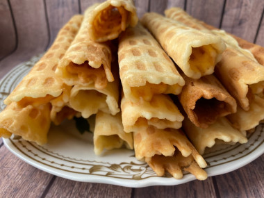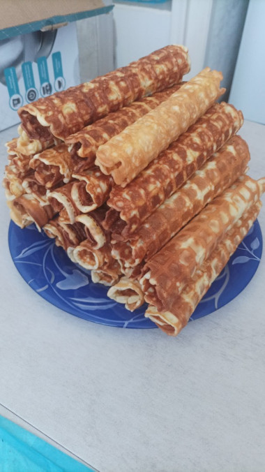 По данному рецепту у меня вышло 18,5 трубочек. Клала по две столовые ложки. Трубочки длинные, красивые, но сложно наполнять. А пот последняя, когда осталась одна столовая ложка, трубочка получилась маленькая и ее легче было наполнить.