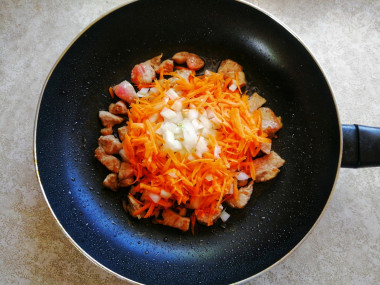 К поджаренному мясу добавьте измельченные овощи - лук и морковь. Перемешайте и обжарьте, помешивая, все вместе пару минут.