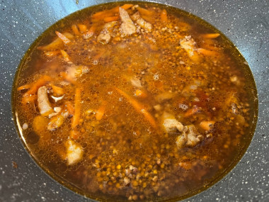 Так же, добавьте оставшуюся воду. По вкусу посыпьте небольшим количеством соли и специи. Доведите все до кипения. Затем накройте крышкой и сделайте маленький огонь. Готовьте гречку по-купечески со свининой минут 15.