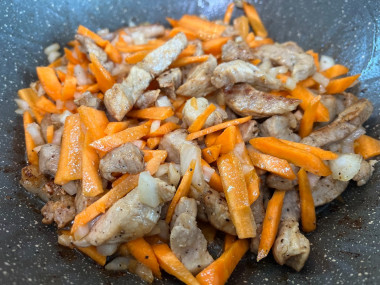 Для приготовления я использовала свинину, но также пробовала готовить с курицей — получается не менее вкусно. Морковь я нарезала соломкой, а лук — кубиками. Томатной пасты у меня не оказалось, и я использовала натуральный кетчуп, он добавил блюду не менее приятный вкус.