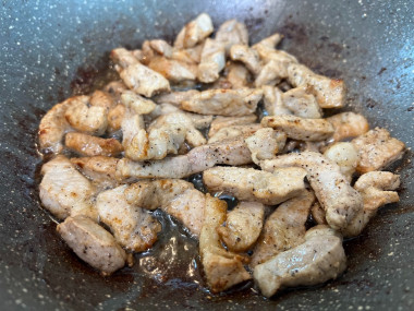 Свинину нарежьте на небольшие кусочки, примерно, одинакового размера. Сковороду разогрейте до горячего состояния и налейте на неё немного растительного масла. Обжарьте мясо до появления золотистого цвета. Не забывайте мясо помешивать, чтобы оно не подгорело.