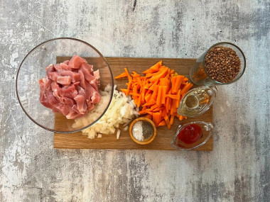 Как сделать гречку со свининой по купечески на сковороде? Подготовьте для этого все необходимые ингредиенты. Свинину берите без костей. Можно допустить в свинине небольшое количество жира. Это может быть окорок, шея или вырезка. Для варки гречки я всегда пользуюсь соотношением гречка-вода, 1 к 2. Поэтому, в данном случае, удобно пользоваться именно стаканами.