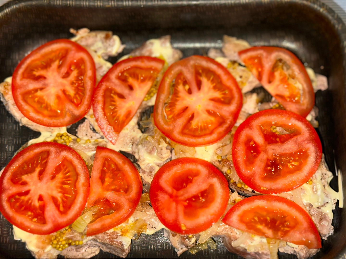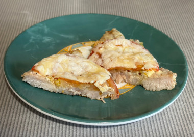 Обычно, для этого рецепта я покупаю уже нарезанные шницели/эскалопы/стейки. Вот и в этот раз у меня в морозилке были шницели из свиной шейки. Они достаточно тонкие, даже отбивать не пришлось. Очень сокращает время приготовления блюда. Помидоров у меня не было. Знаю, что с помидорами мясо получается сочнее и томаты дают некую кислинку мясу. Также если добавить помидор, то можно обойтись без гарнира. Мясо натёрла красным перцем, сушеным чесноком, солью. Масло не добавляла, подумала, что майонеза и сыра достаточно. Спасибо за рецепт!