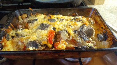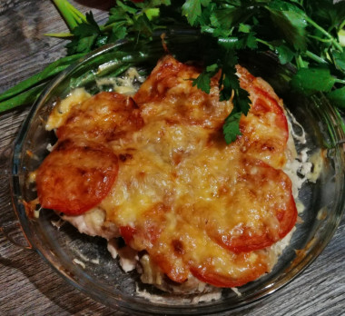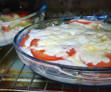 Добавил на дно формы картошечка порезанной кольцами, а сверху с помидорами грибов!!! Великолепно!!! Сам не ожидал что так вкусно получится!!!
