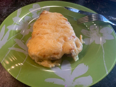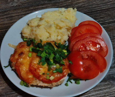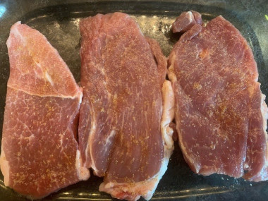 Обычно, для этого рецепта я покупаю уже нарезанные шницели/эскалопы/стейки. Вот и в этот раз у меня в морозилке были шницели из свиной шейки. Они достаточно тонкие, даже отбивать не пришлось. Очень сокращает время приготовления блюда. Помидоров у меня не было. Знаю, что с помидорами мясо получается сочнее и томаты дают некую кислинку мясу. Также если добавить помидор, то можно обойтись без гарнира. Мясо натёрла красным перцем, сушеным чесноком, солью. Масло не добавляла, подумала, что майонеза и сыра достаточно. Спасибо за рецепт!