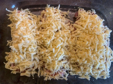 На крупной терке натрите твердый сыр. Щедро посыпьте им слой из помидоров. Чем больше сыра вы добавите, тем вкуснее будет. Можно использовать такие сорта, как Российский, Эдам или Адыгейский. Главное, чтобы продукт был качественным, вкусным и ароматным. В этом блюде сыр должен быть запеченным, потому лучше добавьте его сразу. Но если хотите, чтобы он просто расплавился, добавьте за 15 минут до конца готовки.