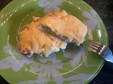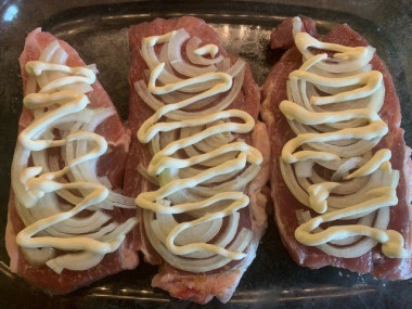 Замечательный рецепт ! Нравится вкус мясо в таком исполнении . Моя изюминка в этом рецепте - грибы поверх лука.Иногда добавляю тёртый на крупной тёрке картофель( смешанный с яйцом и сыром ), потом грибы, вяленые помидоры или свежие, сыр.