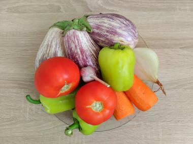 2. Нарежьте кубиками баклажаны, помидоры, перец и лук. Морковь натрите на крупной терке, чеснок - на мелкой.