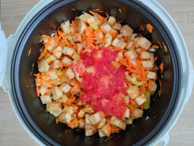 3. В чашу мультиварки налейте масло и положите все овощи. Добавьте соль, перец и перемешайте.
